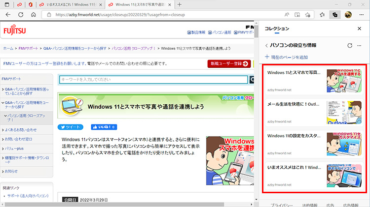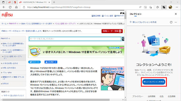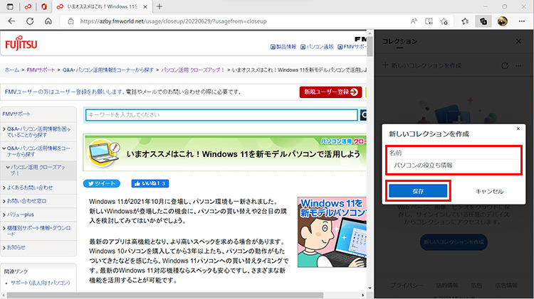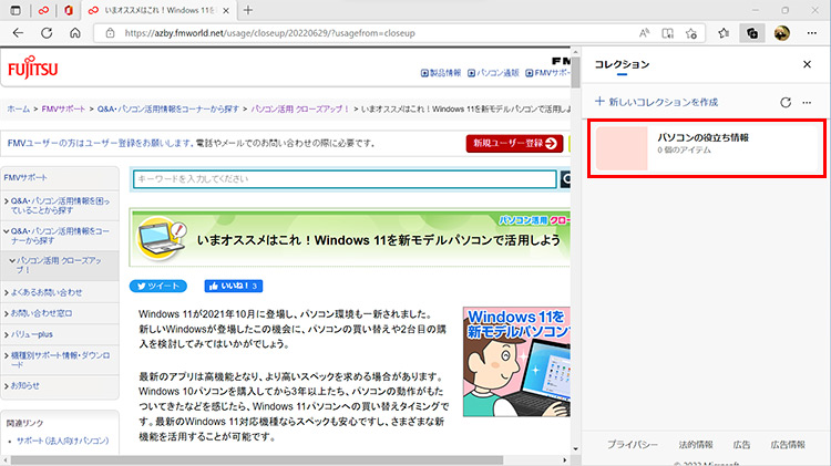 気になる情報を見つけたら、「コレクション」に分類して保存しておくと、後で、すぐに表示することができます。