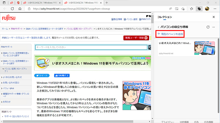 コレクションに追加したいWebページを開いたら、「+現在のページを追加」をクリックします。