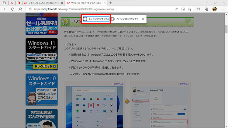 指定したエリアだけ、あるいはページ全体を保存することができます。ここでは、「エリアをキャプチャする」を選びます。