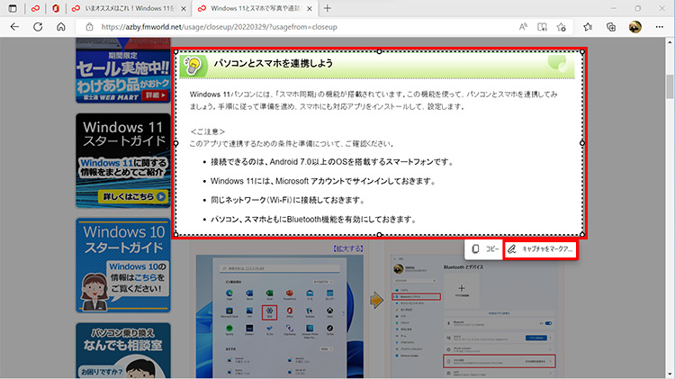 ドラッグしてエリアを指定したら、「キャプチャをマークアップ」を選択します。