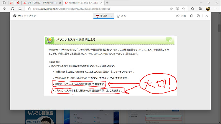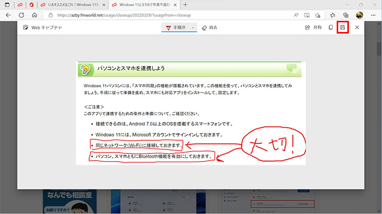 Webページの中でも特に注目したい箇所があるときには、文字や図形を書き込んで、保存しておくことができます。元のWebページが変わったりなくなったりしても、自分のパソコンに保存されているので、自分で見返したり、友達や家族に情報を伝えたりしたいときに、活用することができます。