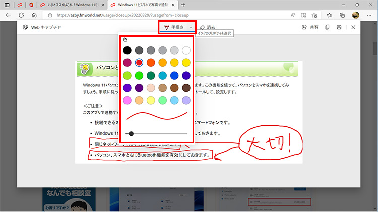 「手描き」で大切なところを強調したり、コメントを書き込みます。