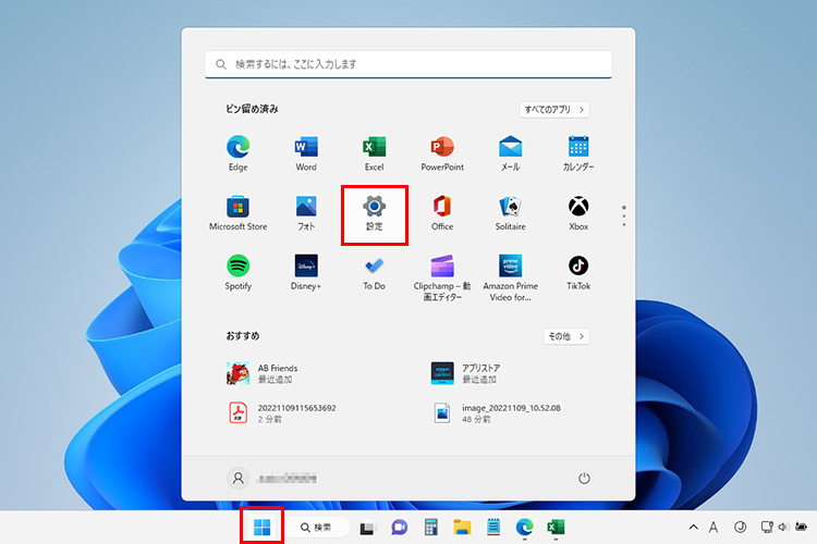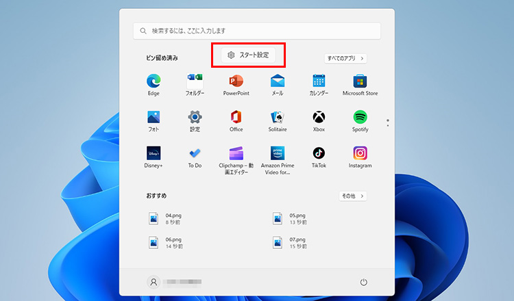 スタートメニューを右クリックし、「スタート設定」をクリックします。