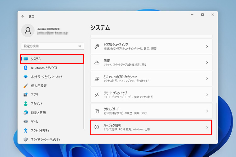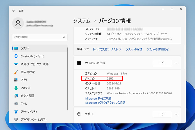 大型アップデートは、いっせいに配信されるわけではなく、順次の配信となるため、ユーザーによって時間差があります。「Windows 11 2022 Update」を適用済みかかどうか、「設定」の「システム」で「バージョン情報」を確認してみましょう。「バージョン」に「22H2」と表示されていたら、アップデートは完了しています。