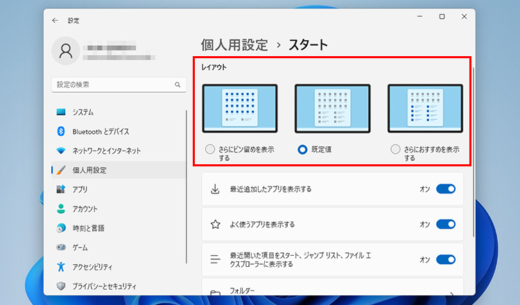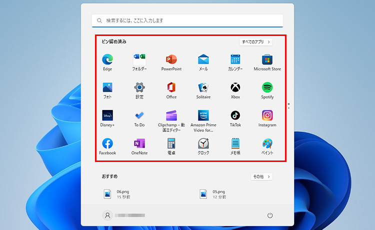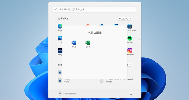 アプリの使用頻度や種類ごとに分類するなど、フォルダーを作成して、スタートメニューにピン留めされているアプリを整理できるようになりました。また、スタートメニューに表示されるピン留め済みのアプリ、おすすめのアプリのレイアウトを選択して、表示領域の割合を変更できるようになりました。