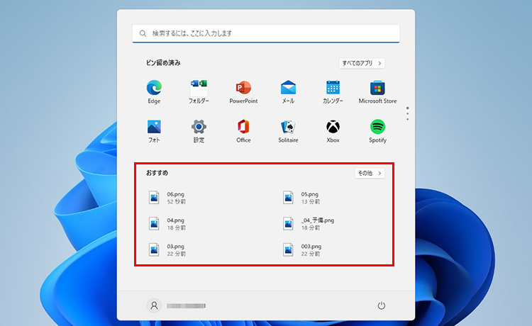 「さらにおすすめを表示する」を選んだ場合、最近使ったファイル、新しいアプリが表示される領域が増えます。