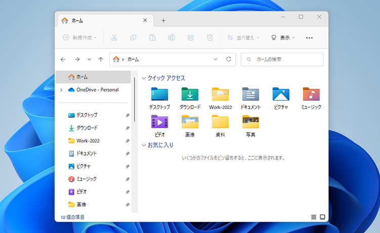 エクスプローラーを開くと「ホーム」が表示されます。よく使うフォルダーやピン留めしたフォルダーは、ウィンドウ左のナビゲーションエリアからアクセスできます。