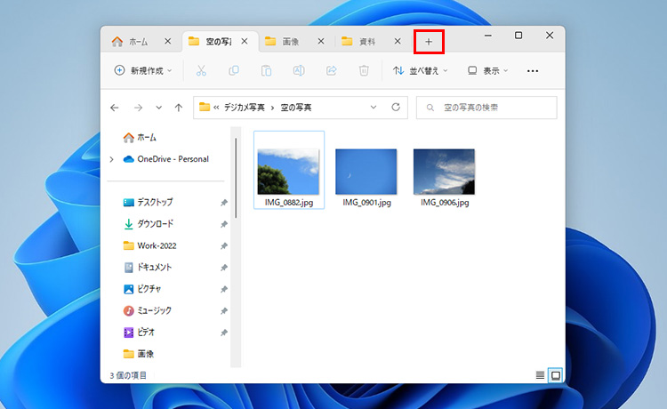 ウィンドウ上部の「+」をクリックすると、新しいタブを追加できます。それぞれ任意のフォルダーを開き、タブを切り替えて利用できます。