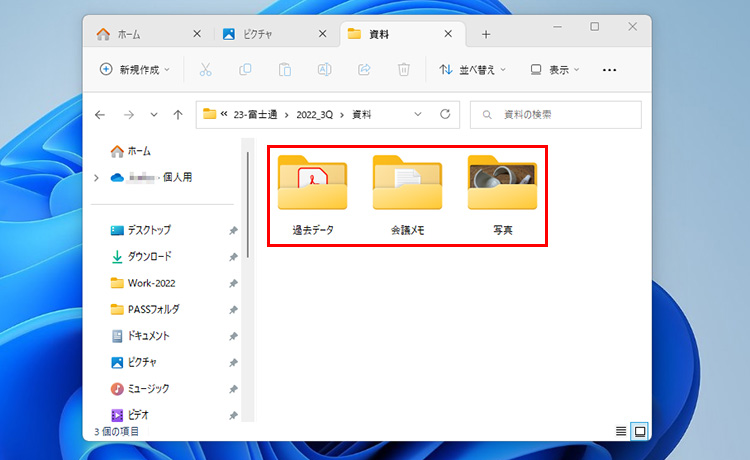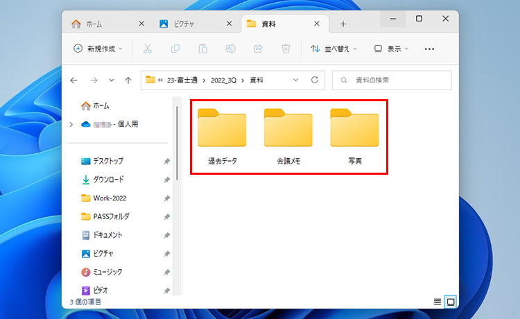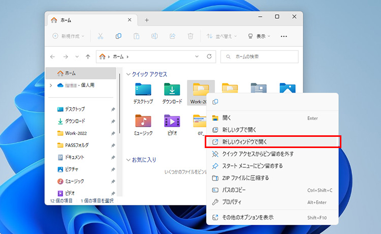 開きたいフォルダーを右クリックして「新しいウィンドウで開く」を選択すると、別のウィンドウで開けます。この右クリックメニューには「新しいタブで開く」も用意されています。