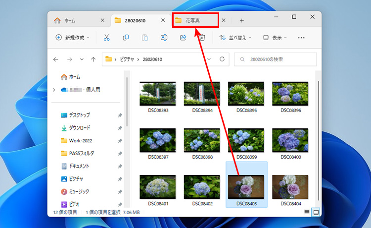 また、ファイルを移動/コピーしたいときは、移動先のフォルダータブにファイルをドラッグすると切り替わるので、フォルダー内にドロップします。