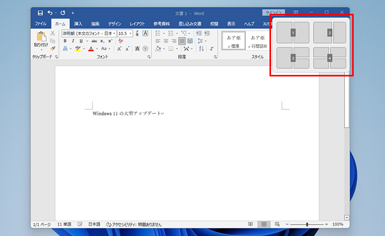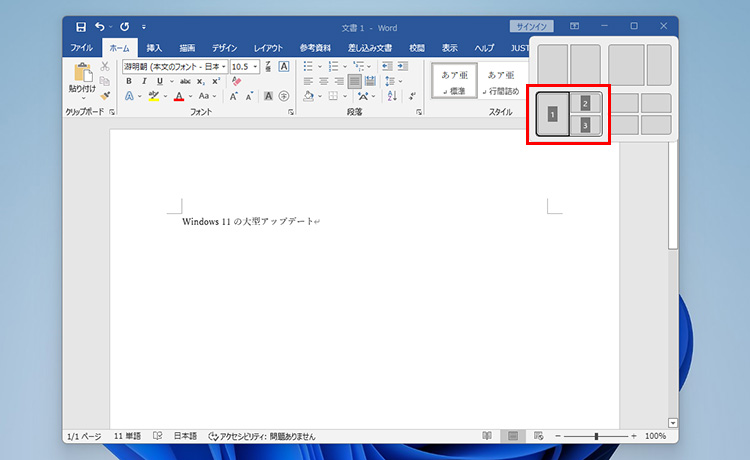 「Windows」+「Z」キーを押すと、スナップレイアウトに番号が表示され、数字キーを押してレイアウトを選択できます。