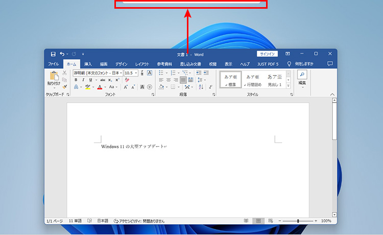 ウィンドウのタイトルバーをドラッグすると、画面上部にバーが表示されるので、バーの位置までドラッグします。