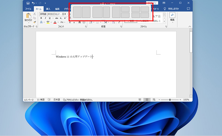 複数のウィンドウを、画面の領域にきれいに配置したいときに便利なスナップレイアウト機能。「最大化」ボタンにマウスを合わせるか「Windows」+「Z」キーを押すことでレイアウトを表示できますが、これまではレイアウトの選択にはマウス操作が必要でした。アップデートにより、レイアウトの選択をキーボードからも行えるようになりました。また、画面上部にウィンドウをドラッグしたときにもスナップレイアウトが表示されるなど、使いやすく改良されました。