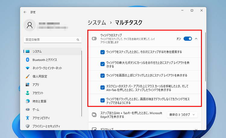 「設定」画面の「システム」-「マルチタスク」-「ウィンドウのスナップ」で、個々の設定をオン/オフできます。