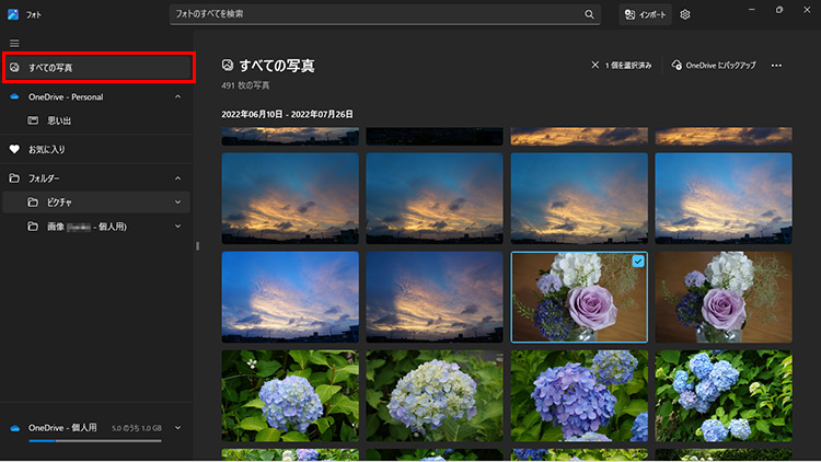 写真は「Microsoftフォト」で一括管理。「すべての写真」を選ぶと、フォルダー内の画像、OneDriveの画像など、すべての写真を一覧表示できます。