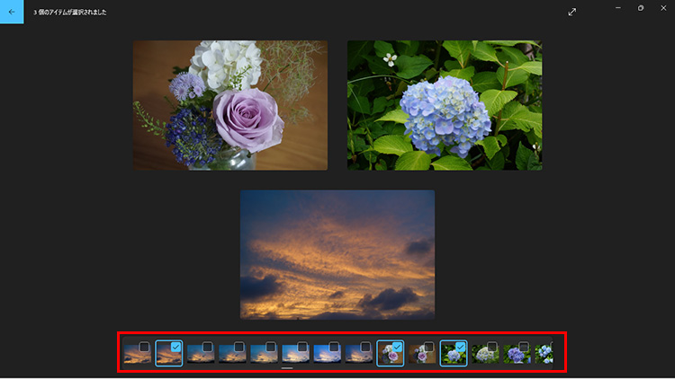 一覧の写真をダブルクリックするとビューワー画面が表示されます。下部にはフィルムのような「映画ストリップ」と呼ばれるサムネイルが表示され、選択してた画像をマルチビューで表示し、比較できます。