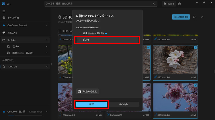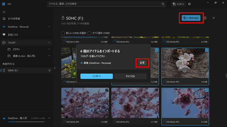 SDカードなどの外部デバイスから写真を取り込む際は、保存先としてOneDriveが示されます。パソコン内に保存したいときは「変更」をクリックします。