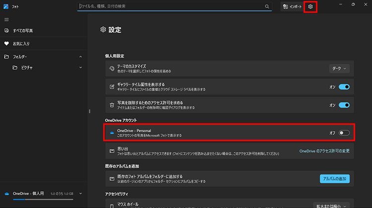 Microsoftフォトで、OneDriveの写真を表示したくない場合や、OneDriveへバックアップしたくない場合は、Microsoftフォトの設定で、OneDriveとの連携を解除することができます。