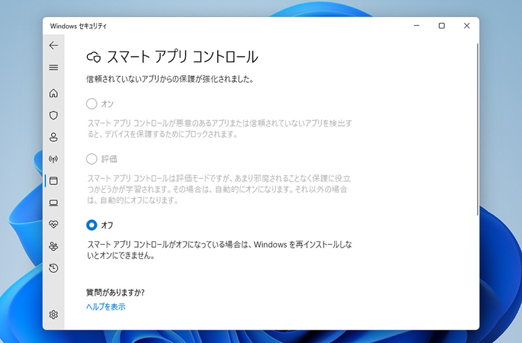 悪意のあるアプリや信頼されていないアプリを判断して、ブロックしてくれる機能です。新しい脅威などからパソコンを保護します。ただし、Windows 11のクリーンインストールでのみ使用できる機能のため、既存のWindows 11からのアップグレードでは「オフ」になっています。