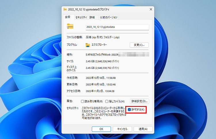 スマートアプリコントロールが「オン」になり、実行したいアプリがブロックされた場合でも、アプリのプロパティを開き、「セキュリティ」で「許可する」をチェックすることで、開くことができるようになります。
