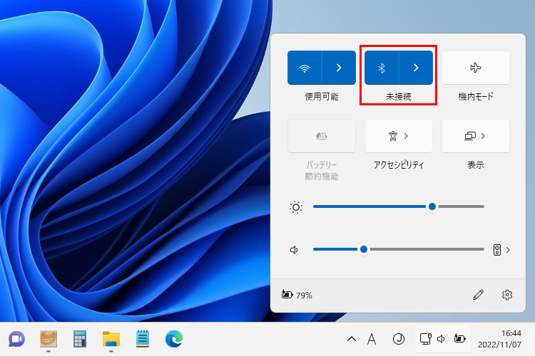 アクションセンターでBluetoothのオン/オフをできるだけでなく、機器をペアリングして接続できます。
