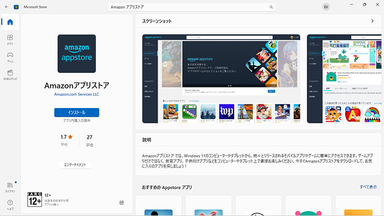 パソコンでAndroidアプリを利用するには、まず「Microsoft Store」を開き、「Amazonアプリストア」アプリをインストールします。