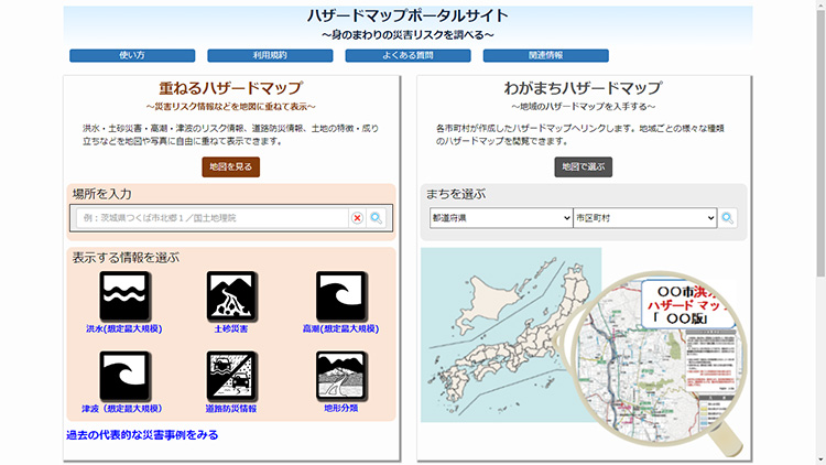 「ハザードマップ」は、自然災害の被害想定区域や避難場所を示した地図です。自分が住んでいる地域にどのような災害が予測されるのか、自治体のハザードマップで確認できます。国土交通省が運営するWebサイト「ハザードマップポータルサイト