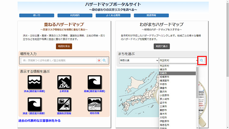「わがまちハザードマップ」の「まちを選ぶ」から、「都道府県」「市区町村」を選び、右側にある虫眼鏡のアイコンをクリックします。