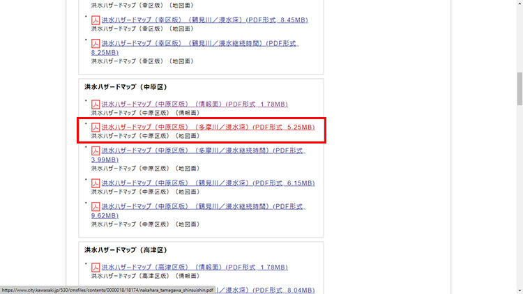 下にスクロールすると、ハザードマップのPDFリンクが表示されます。