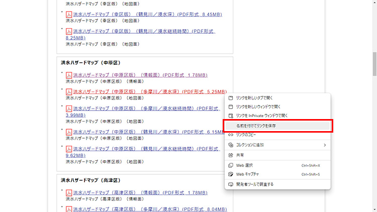PDFをダウンロードするには、ダウンロードしたいPDFのリンクを右クリックして「名前を付けてリンクを保存」を選択すると保存できます。