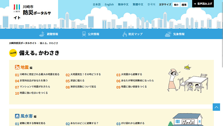 画面は川崎市防災ポータルサイトの「備える。かわさき」ページ。
