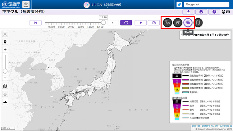 「キキクル(危険度分布)」にアクセス。右上のアイコンで、土砂災害、浸水外、洪水害の情報を切り替えられます。