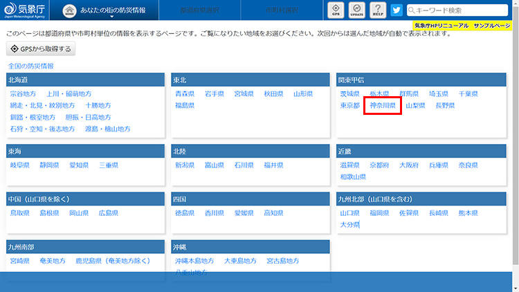 「あなたの街の防災情報」にアクセスし、住んでいる地域を選びます。