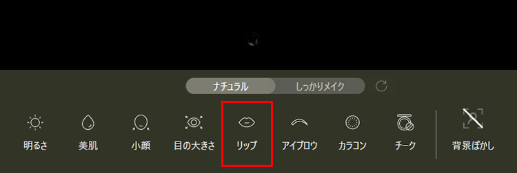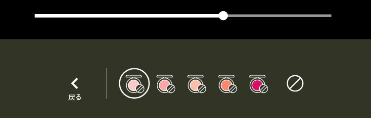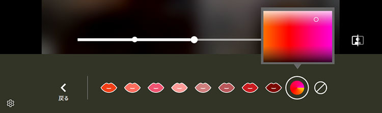 顔補正を行う際には、スライドバーでの効果の調整や、多彩なカラーバリエーションから色の選択が可能です。リップの色味や濃淡、補正効果の効き具合など微妙な変化をつけられるため、思い通りの補正効果に仕上がります。