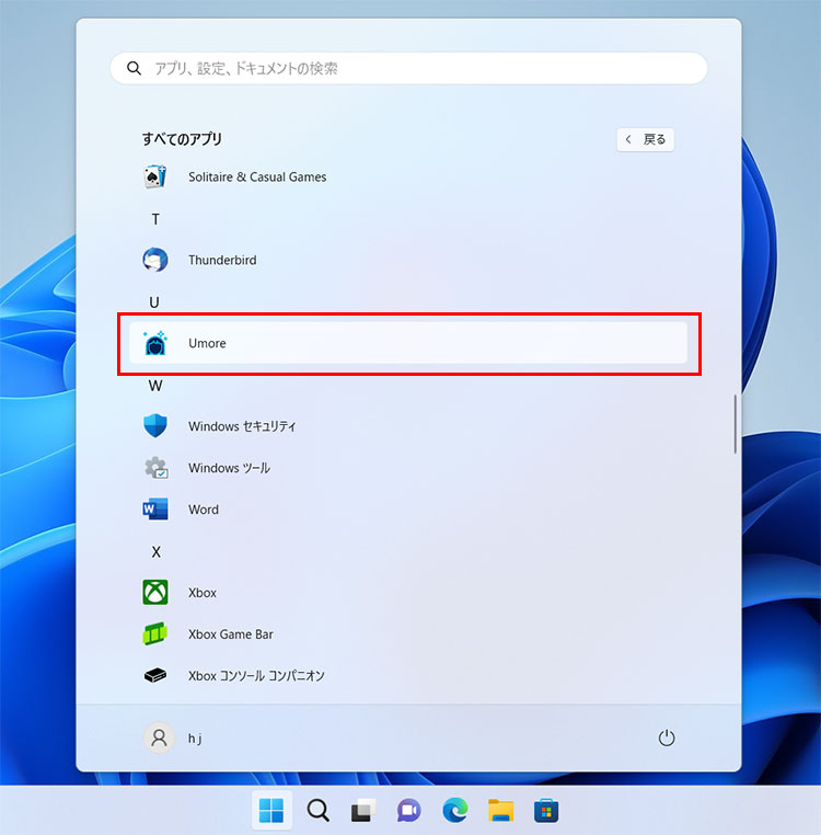 スタートメニューを開いて[すべてのアプリ]をクリックし、「Umore」をクリックして開きます。