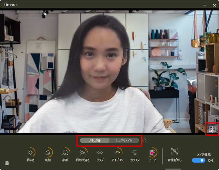 Umoreは、個人の好みに合わせて微調整が可能で、自然な顔補正効果が期待できます。また、画面全体の補正を使えば、照明や窓の位置によって顔が暗く映ってしまうときも手早く解決できます。