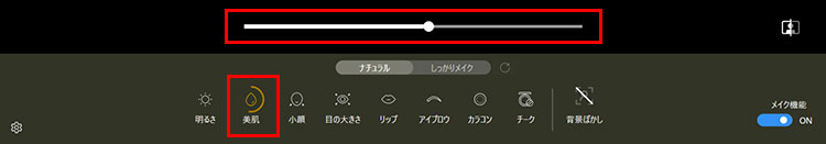 「美肌」アイコンをクリックし、表示されたスライドバーを動かして肌質を整えます。右に動かすほど肌質がなめらかになります。