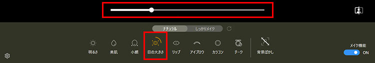 「目の大きさ」アイコンをクリックし、表示されたスライドバーを動かして目の大きさを調整します。右に動かすほど大きくなります。