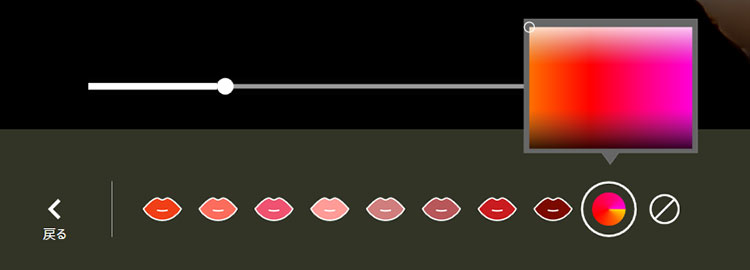 表示されたリップのカラーと濃淡を調整します。既存の8つのカラーに加え、色つきの丸アイコンをクリックし、カラー選択ツールから選ぶことも可能です。