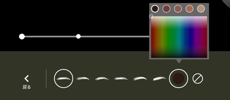眉の形とカラー、濃淡を調整します。眉の形は既存の6つの形から、カラーは色つきの丸アイコンをクリックし、カラー選択ツールから選びます。