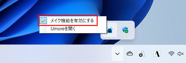 タスクトレイのUmoreのアイコンを右クリックし、[メイク機能を有効にする]をクリックします。