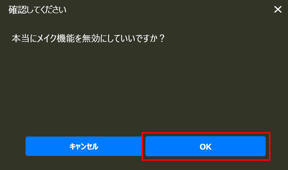 確認画面が表示されるので、[OK]をクリックすると、顔補正効果が無効になります。なお、再度[メイク機能を有効にする]をクリックすると、顔補正効果が有効になります。