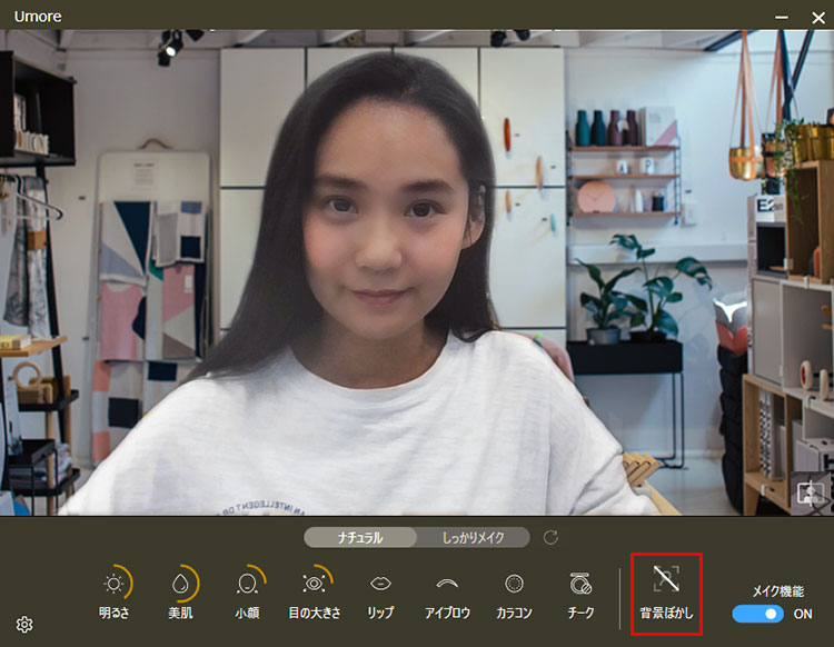 Umoreには顔補正の効果だけでなく、画面全体の効果を設定する項目があります。部屋の明るさが上手く調節できないとき、部屋が散らかっていて画面に映り込んでしまうときなどに「明るさ・背景ぼかし」の項目を活用して、画面全体の様子をスッキリさせましょう。