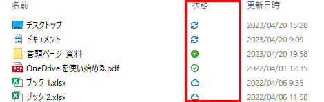 「状態」の列に表示される「チェックマークのアイコン」はパソコンと同期している、「雲のアイコン」はオンラインでのみ使用できる、「矢印の円のアイコン」はアップロード中であることを表しています。