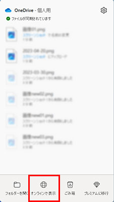 同期の内容はオンライン上でも確認できます。タスクバーのOneDriveアイコンをクリックし、[オンラインで表示]をクリックします。