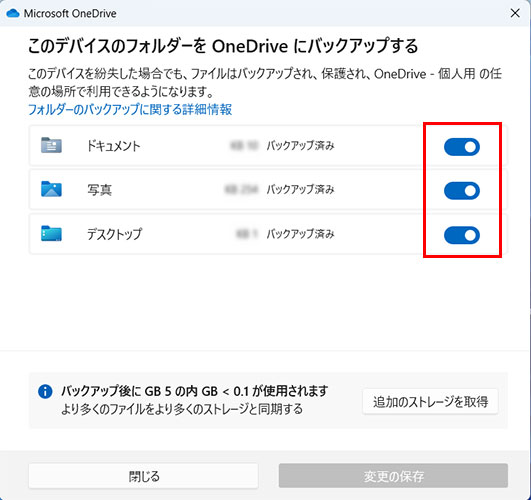 「デスクトップ」、「ドキュメント」、「ピクチャ」は日々ファイルが増えていきやすいフォルダーなので、一度同期を解除して、その後必要になったら再度同期を設定すると良いでしょう。