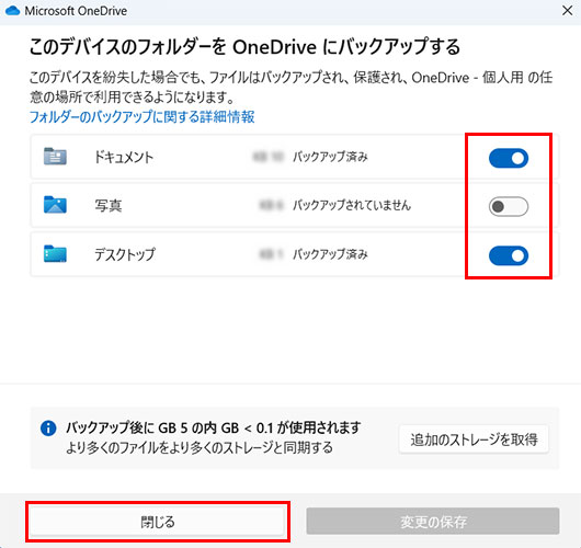 バックアップを停止した項目(今回は写真)がオフになり、「バックアップされていません」の表示に変わっていたら[閉じる]をクリックして完了です。