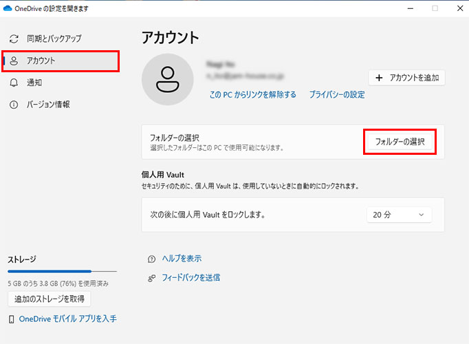 [アカウント]をクリックして画面を切り替え、[フォルダーの選択]をクリックします。「Microsoft OneDrive」という画面が表示された場合でも同じように[アカウント]→[フォルダーの選択]をクリックします。