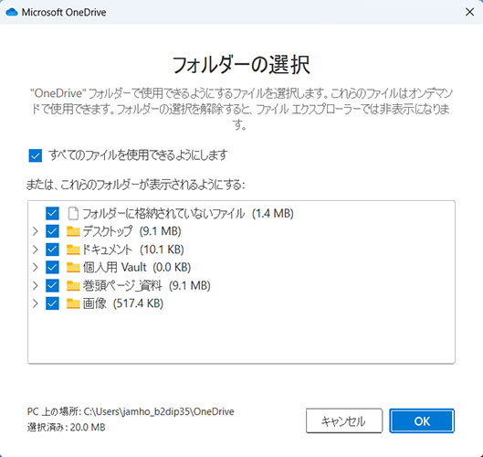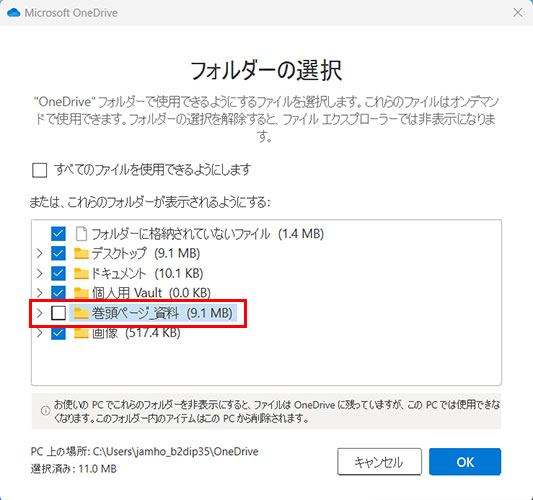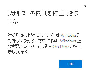 「デスクトップ」、「ドキュメント」、「ピクチャ(画像)」を同期の対象にしていると、このような画面が表示されることがあります。これらのフォルダーは、個別に解除することができません。