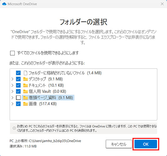 同期を解除するフォルダーを選択できたら、[OK]をクリックして完了です。
